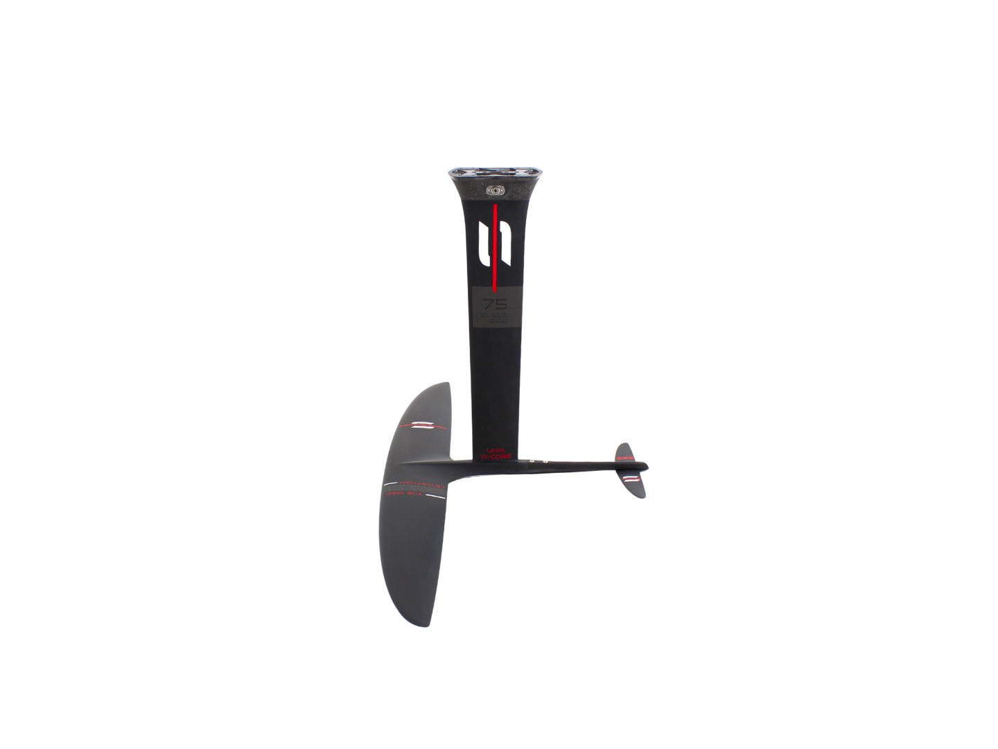Supporting this powerhouse is the FC/M Modular back-fuselage. This full carbon backbone provides the ultimate platform for customization: its modular nature allows you to swap to your preferred stabilizer and use shims for precise tuning. This means you can micro-adjust the angle of attack to match your pumping cadence and weight, ensuring the system feels like a natural extension of your body. Paired with the SF/325 flat stabilizer, the setup minimizes drag and maximizes agility, turning a high-surface wing into a responsive carving machine. Finally, the M75/BB ultra-high modulus mast with W-Core technology ensures a direct connection between board and hydrofoil for the best performance.